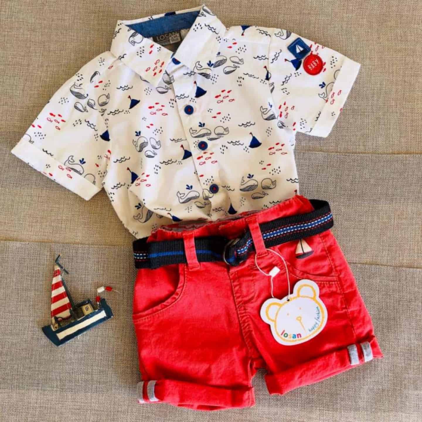 Set compus din camasa cu maneca scurta imprimata cu motive marine si pantaloni care au inclusa cureaua.